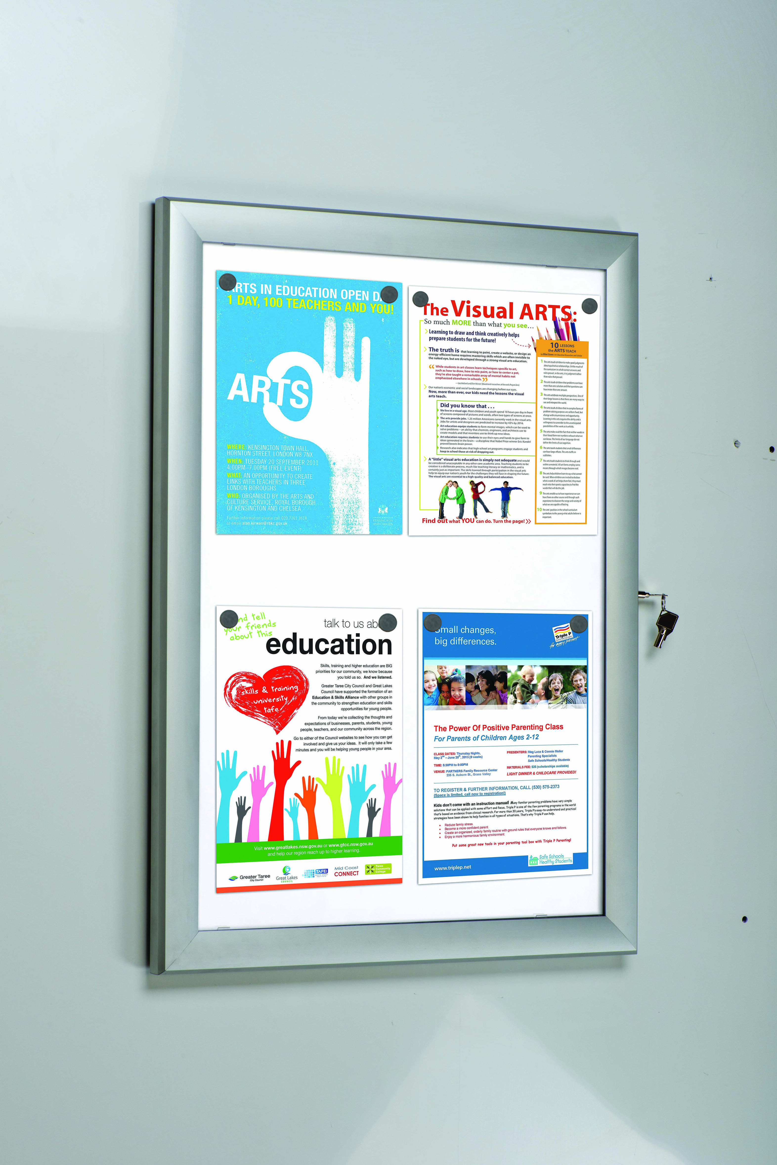 Cornice porta annunci con anta a battente con chiusura a serratura con chiave.